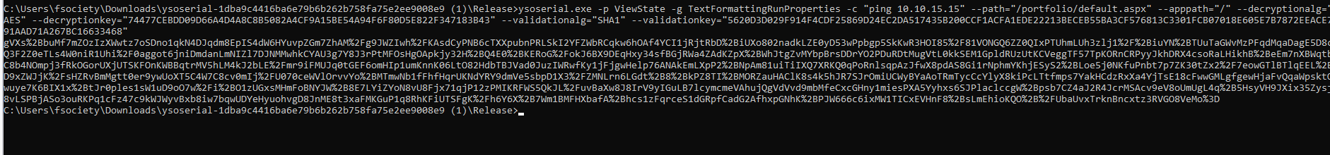 Para forjar el ViewState malicioso usé ysoserial.net, una herramienta que automatiza la construcción de payloads de deserialización para múltiples frameworks .NET.
