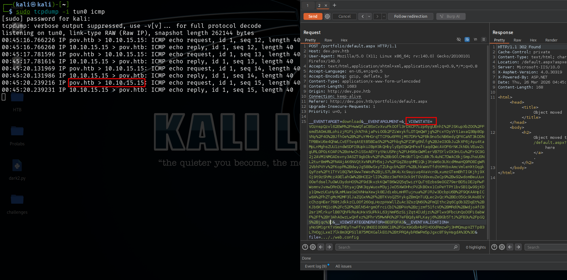 En tcpdump recibí los pings. El servidor tomó mi __VIEWSTATE, verificó la firma HMAC con su validationKey — válida porque usé la misma key — lo descifró con su decryptionKey — válido por la misma razón — y llamó a BinaryFormatter.Deserialize() que ejecutó la gadget chain y lanzó el ping hacia mi máquina. RCE confirmado.