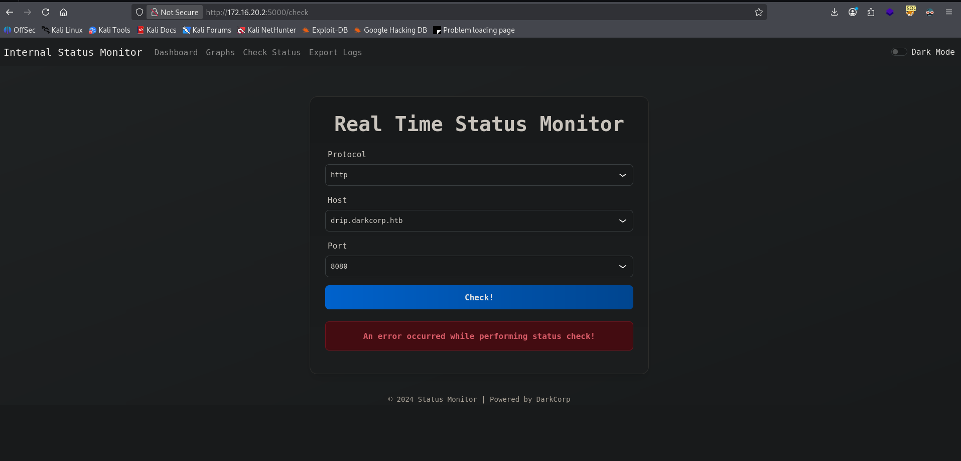 Activo Responder y desde la web le doy a “Check!” apuntando al dominio drip.darkcorp.htb:8080. En cuestión de segundos, Responder captura el hash