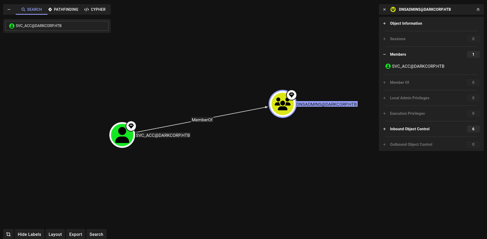 Aquí es donde la cosa se pone realmente interesante. Al revisar en BloodHound los grupos a los que pertenece svc_acc (había recolectado información del AD anteriormente), noto algo clave: esta cuenta es miembro del grupo DNSAdmins.