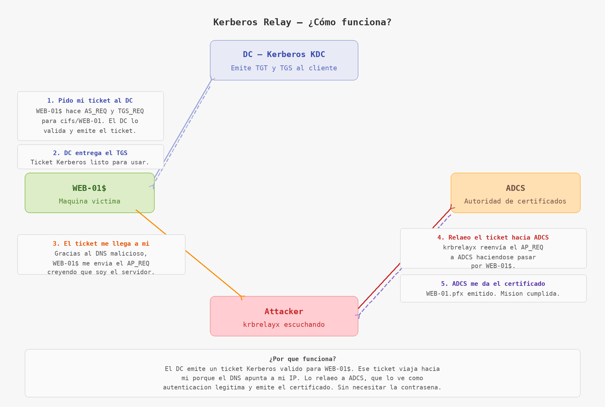 Aquí es donde entra el Kerberos Relay. La idea es simple pero letal: si puedo hacer que esa cuenta se autentique contra algo que yo controlo, puedo capturar esa autenticación Kerberos y relayarla (redirigirla) hacia otro servicio, en este caso Active Directory Certificate Services (ADCS).