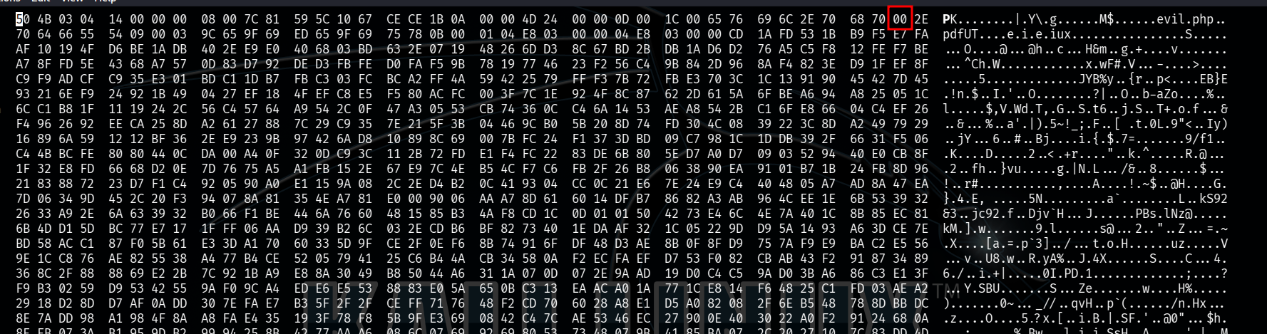 Necesito que al momento de inyectar el null byte, el nombre del archivo quede limpio del lado del sistema. Si solo pusiera evil.php.pdf y reemplazara ese único punto por \0, quedaría evil.php\0pdf — sin punto antes de la extensión, un nombre roto que el sistema no va a manejar bien. En cambio con evil.php..pdf, cuando reemplazo el primer punto por \0 queda evil.php\0.pdf — uno de los puntos lo sacrifico como null byte y el otro se queda cumpliendo su función natural, ser el punto de la extensión .pdf. El validador lee el string completo y ve .pdf , todo tranquilo.