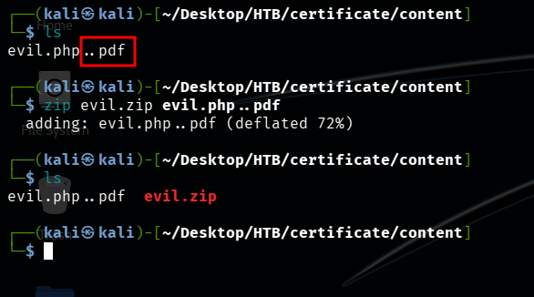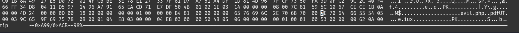 Ahora el zip contiene evil.php\0.pdf. Subo el zip, el validador ve .pdf y lo aprueba sin levantar ninguna alerta.