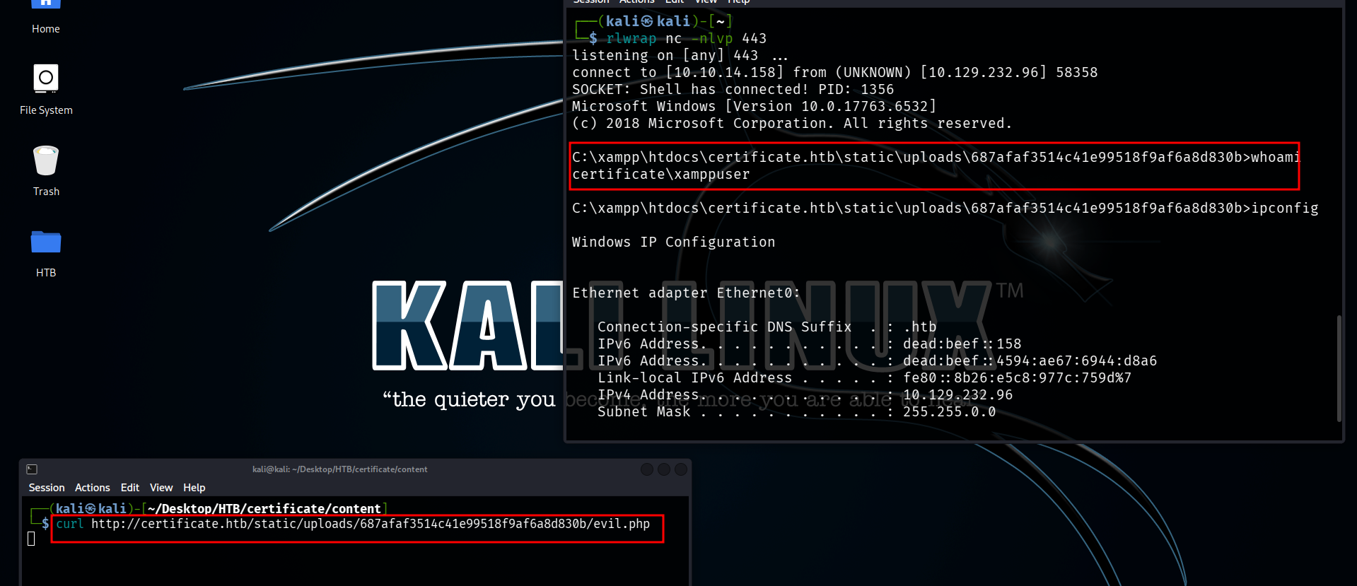 Voy a la URL donde quedó almacenado el archivo, apunto directo a evil.php, le hago un curl y el servidor lo encuentra, lo interpreta como PHP y ejecuta el código malicioso. En mi listener con netcat recibo la conexión — shell dentro del servidor, corriendo como el usuario de XAMPP.