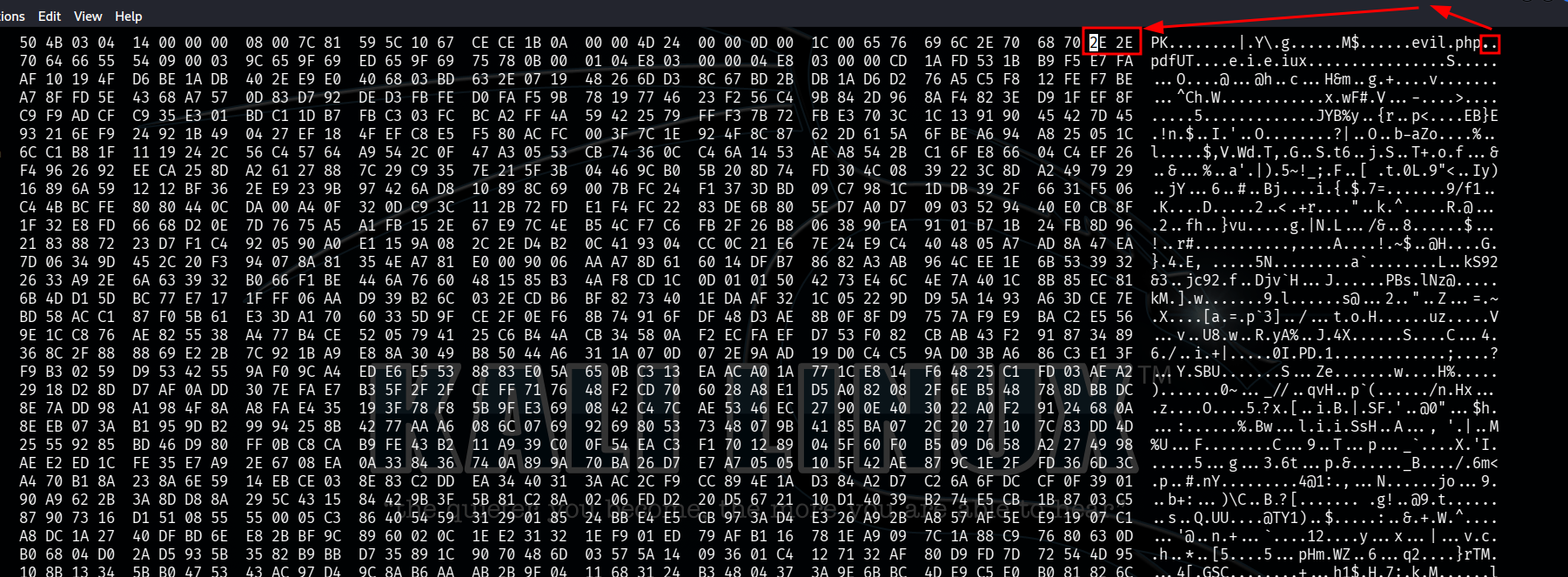Ahora abro ese zip con hexedit, que me permite ver y editar la data cruda del archivo en hexadecimal. Dentro del zip el nombre del archivo está almacenado en dos lugares — en el header local y en el central directory, que es básicamente el índice interno del zip que le dice al sistema qué archivos contiene y dónde están. En ambos lugares busco el nombre evil.php..pdf y localizo los dos puntos representados en hex como 2E 2E. Reemplazo el primer 2E por 00 en las dos ocurrencias. Si no lo hago en ambas, el zip queda inconsistente y puede fallar al extraerse.