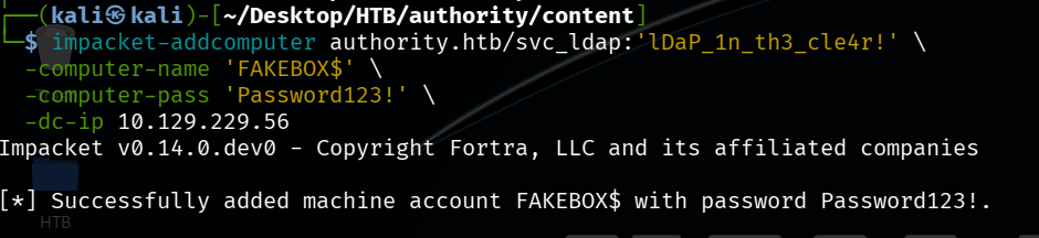 Uso impacket-addcomputer para agregar una computadora al dominio con las credenciales de svc_ldap. Esto es posible porque por defecto en Active Directory cualquier usuario autenticado puede unir hasta 10 computadoras al dominio (atributo ms-DS-MachineAccountQuota).