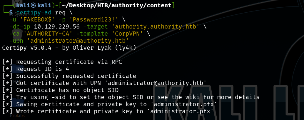 Con las credenciales de FAKEBOX$ solicito el certificado especificando el UPN de Administrator en el SAN. Esto es el núcleo de ESC1: el template no valida que el solicitante sea realmente el usuario que declara en el certificado.