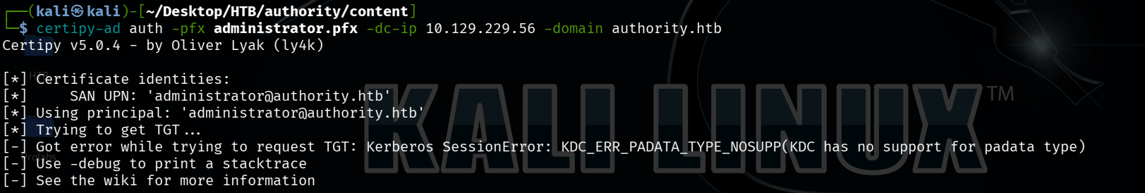 Cuando exploto ESC1 y obtengo un .pfx como Administrator, el flujo normal es usar ese certificado para autenticarme vía Kerberos y obtener un TGT — esto se llama PKINIT (Public Key Cryptography for Initial Authentication in Kerberos).