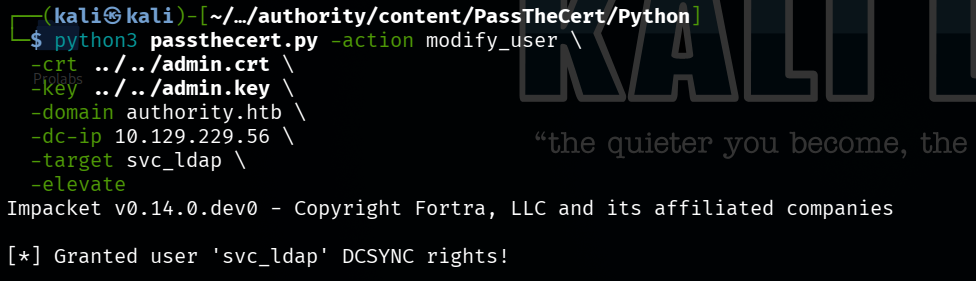 La herramienta confirma: Granted user 'svc_ldap' DCSYNC rights!