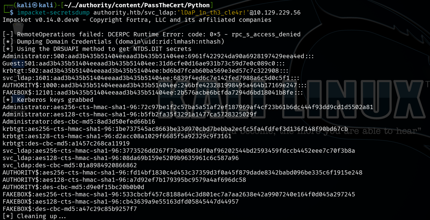 Esto funciona porque LDAP sí acepta autenticación por certificado (SASL EXTERNAL / TLS client auth), a diferencia del KDC en este DC. Ahora svc_ldap puede replicar el directorio como si fuera un Domain Controller.