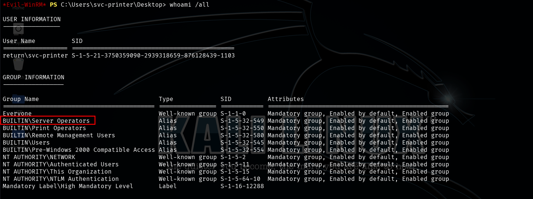 BUILTIN\Server Operators Alias S-1-5-32-549 Mandatory group, Enabled by default, Enabled group